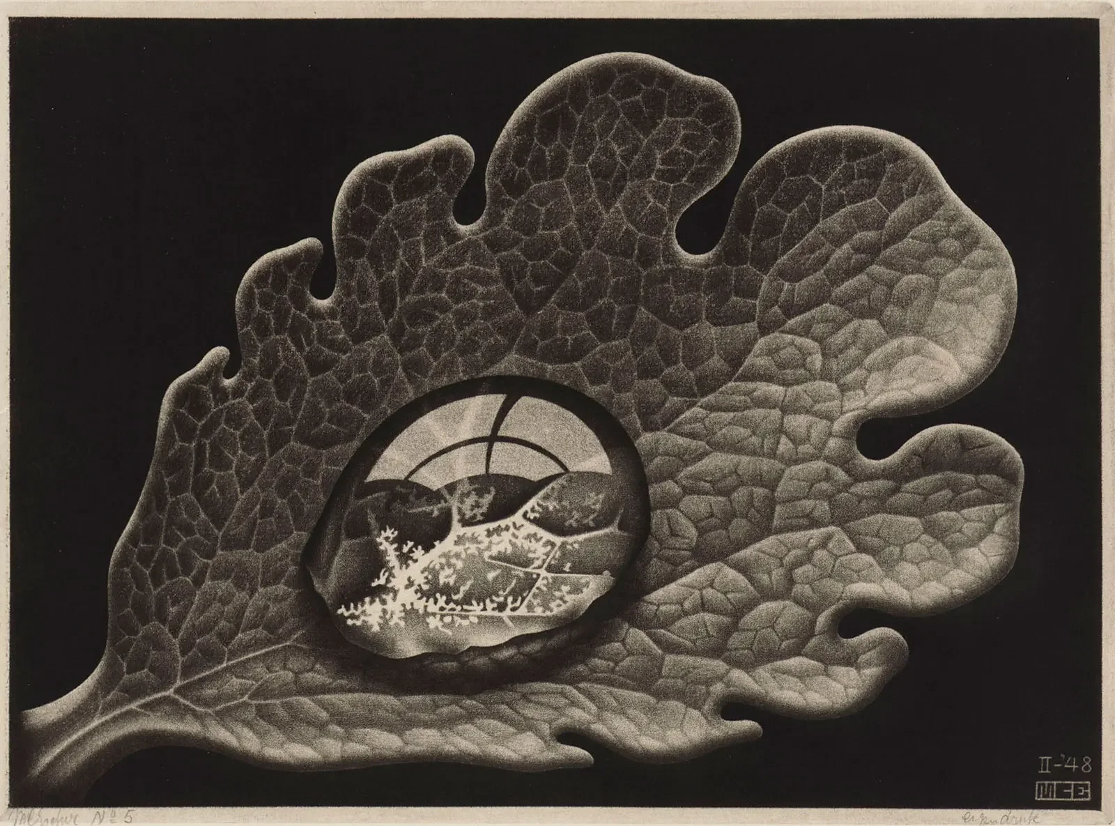 He drew with a realist’s discipline, composed like an architect, and treated the picture as a system that had to hold together. The result is unmistakable: tessellations that lock without gaps, impossible constructions that remain calm while breaking space, transformations that glide from one motif to another, and reflections that fold a whole room into the curve of a palm.