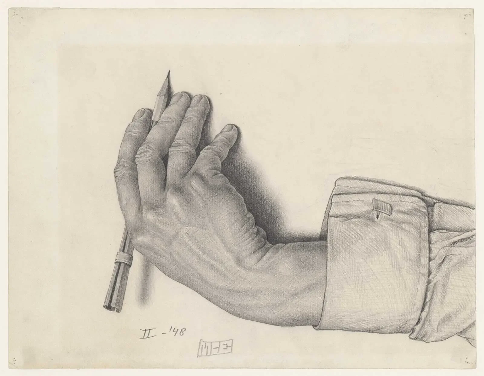 This dual dexterity shaped more than just his technique. It resonated with the deeper themes of balance, inversion, and symmetry that run through his art. In Drawing Hands (1948), one hand holds the pencil in a right-handed grip, while the other mirrors it in a left-handed pose. Rather than a mistake or hidden clue about Escher’s dominant hand, it’s best understood as a self-aware metaphor: two hands creating each other, neither one fixed as dominant.