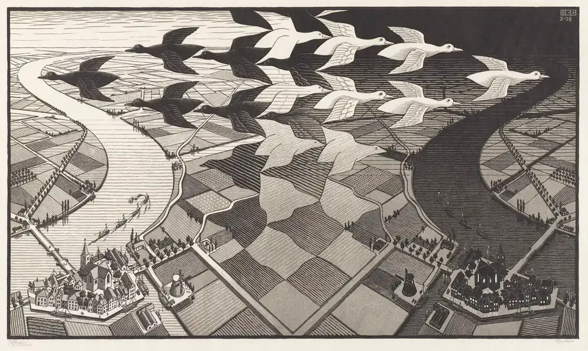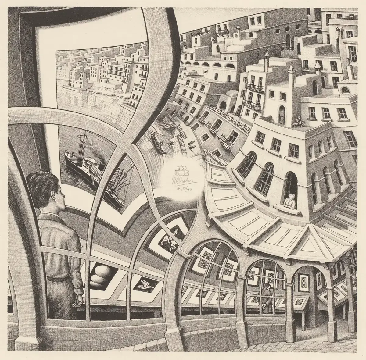 Print Gallery is constructed using a mathematical technique called exponential expansion. Escher divided the image into a grid and applied a transformation that compresses scale toward the center while expanding it toward the edges. The result is that the same space appears at multiple scales simultaneously; what begins as a small framed print becomes, through continuous expansion, the full-scale environment containing the gallery.