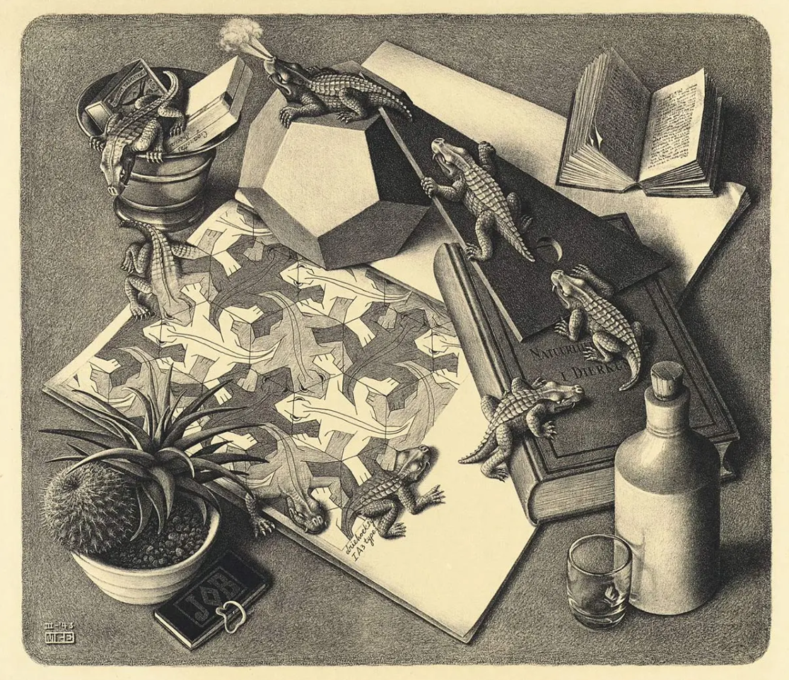 M.C. Escher’s Reptiles (1943) is one of his most playful and imaginative prints. At first glance it looks like a simple domestic scene: a desk littered with books, papers, and everyday objects. But at the center of the composition lies something impossible. A tessellation of lizards on a sheet of paper has come alive. The tiny reptiles climb out of the drawing, march across the real-world objects, and then crawl back into the paper as if nothing unusual had happened.